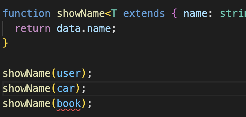 interface User { name: string; age: number; } interface Car { name: string; color: string; } interface Book { price: number; } const user: User = { name: "a", age: 10 }; const car: Car = { name: "bmw", color: "blue" }; const book: Book = { price: 3000 }; function showName(data): string { // 📌 지금 data 파라미터는 받아오는 인자값에 name이 없으므로 error를 나타내게 되며, any 타입으로 임의 지정되어있다. return data.name; } showName(user) showName(car) showName(book)
